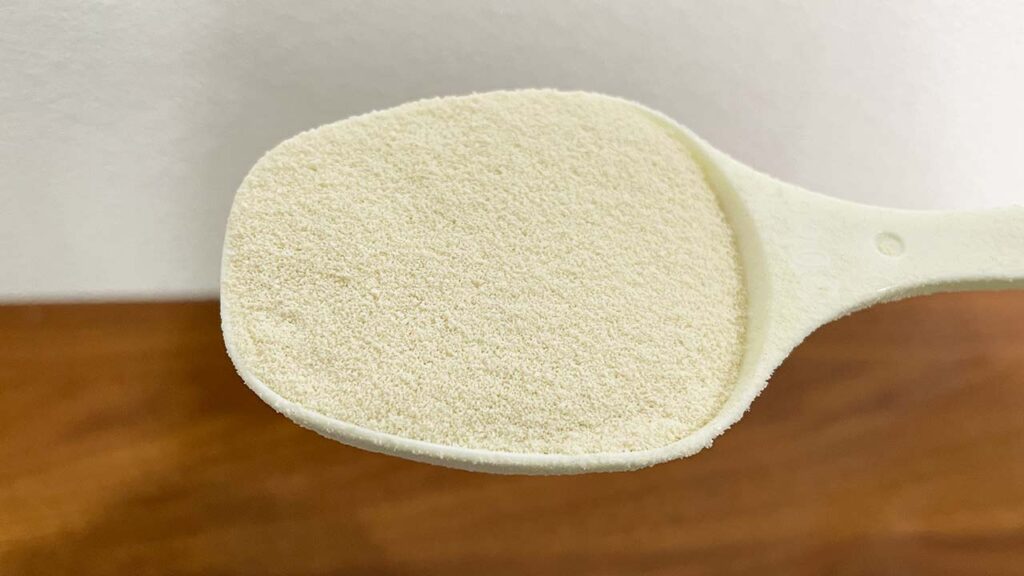 粉末はやや黄みがかった白色でサラサラとしており、見た目からも溶けやすさが伝わります。